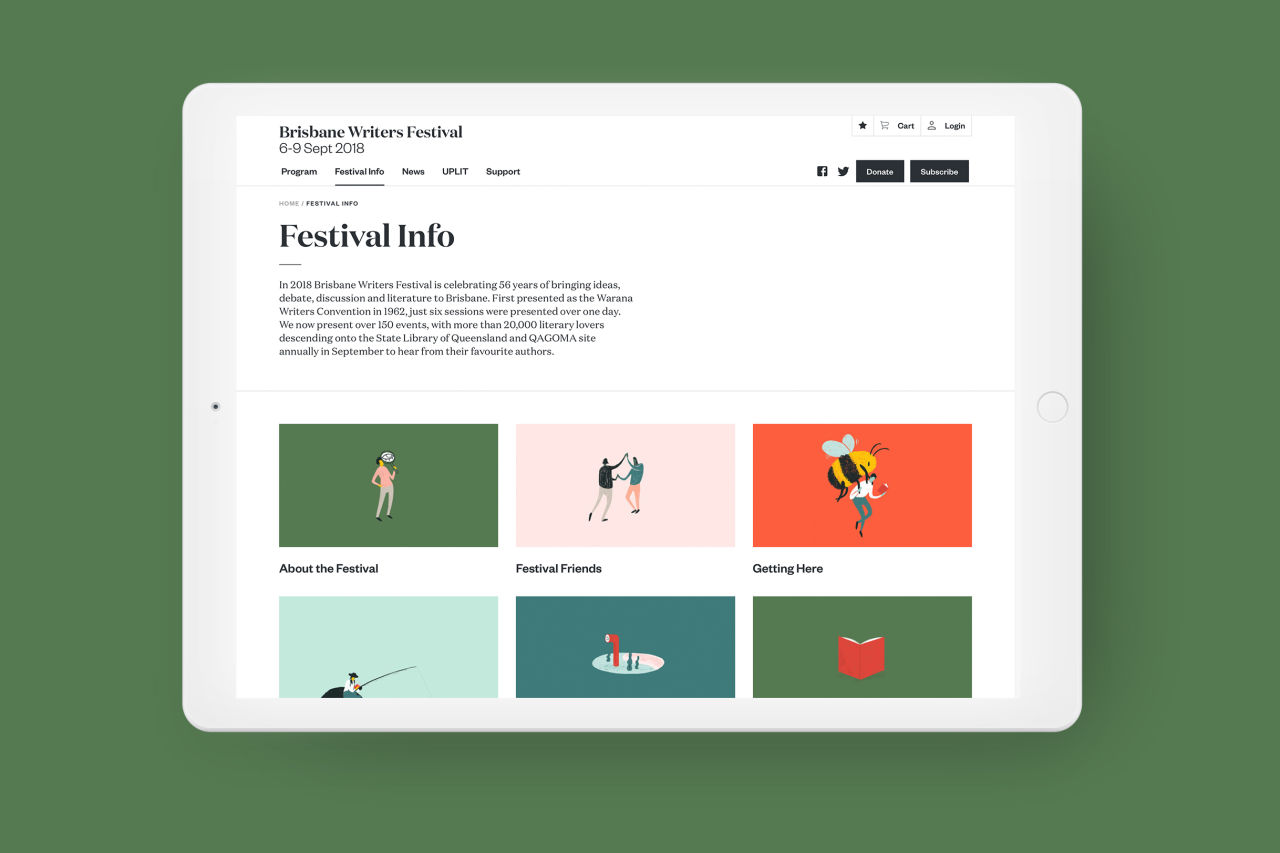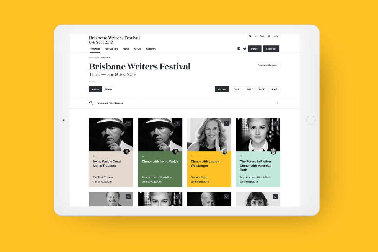Each year, the Brisbane Writers Festival selects a theme that unites its events, workshops and conversations. With this in mind, our challenge was to build a brand that could sustain a constant change of visual styles and conceptual ideas. A brand ‘base’ was built using smart typographic choices and a flexible colour palette, enabling the festival to refresh each year while keeping core brand elements the same.