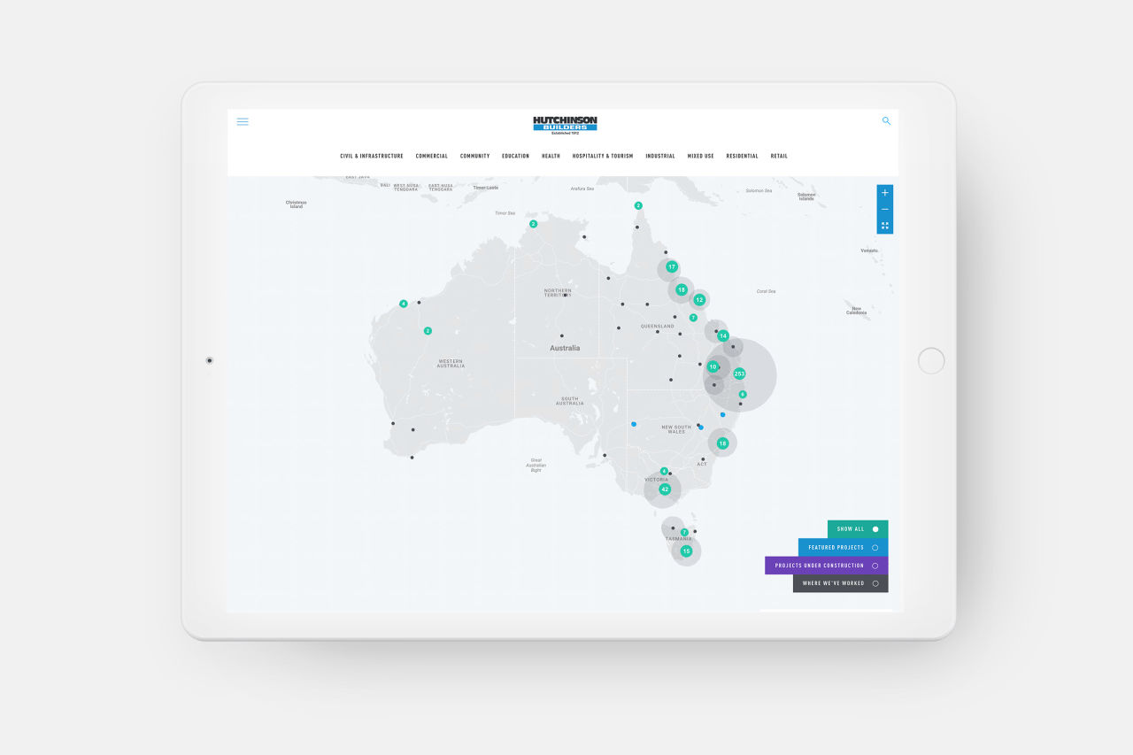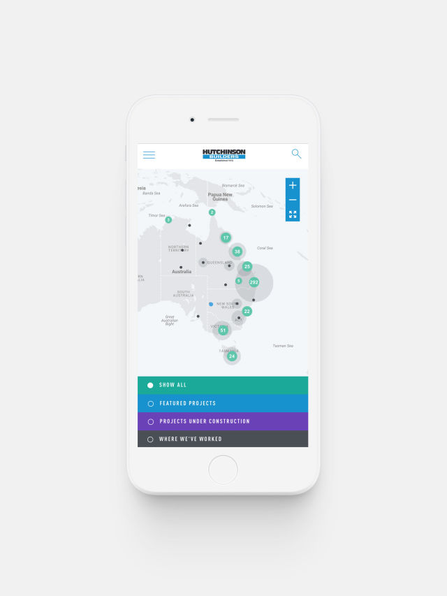 Hutchies have delivered 3,750 projects to date. With a growing number on the horizon, our team created a dynamic map with the capability to reflect the company’s national offering at any given time. The map’s functionality is multipurpose — it allows clients and stakeholders to quickly understand the company’s scope of work, and provides a visualisation of Hutchies’ impact over the past 100 years.