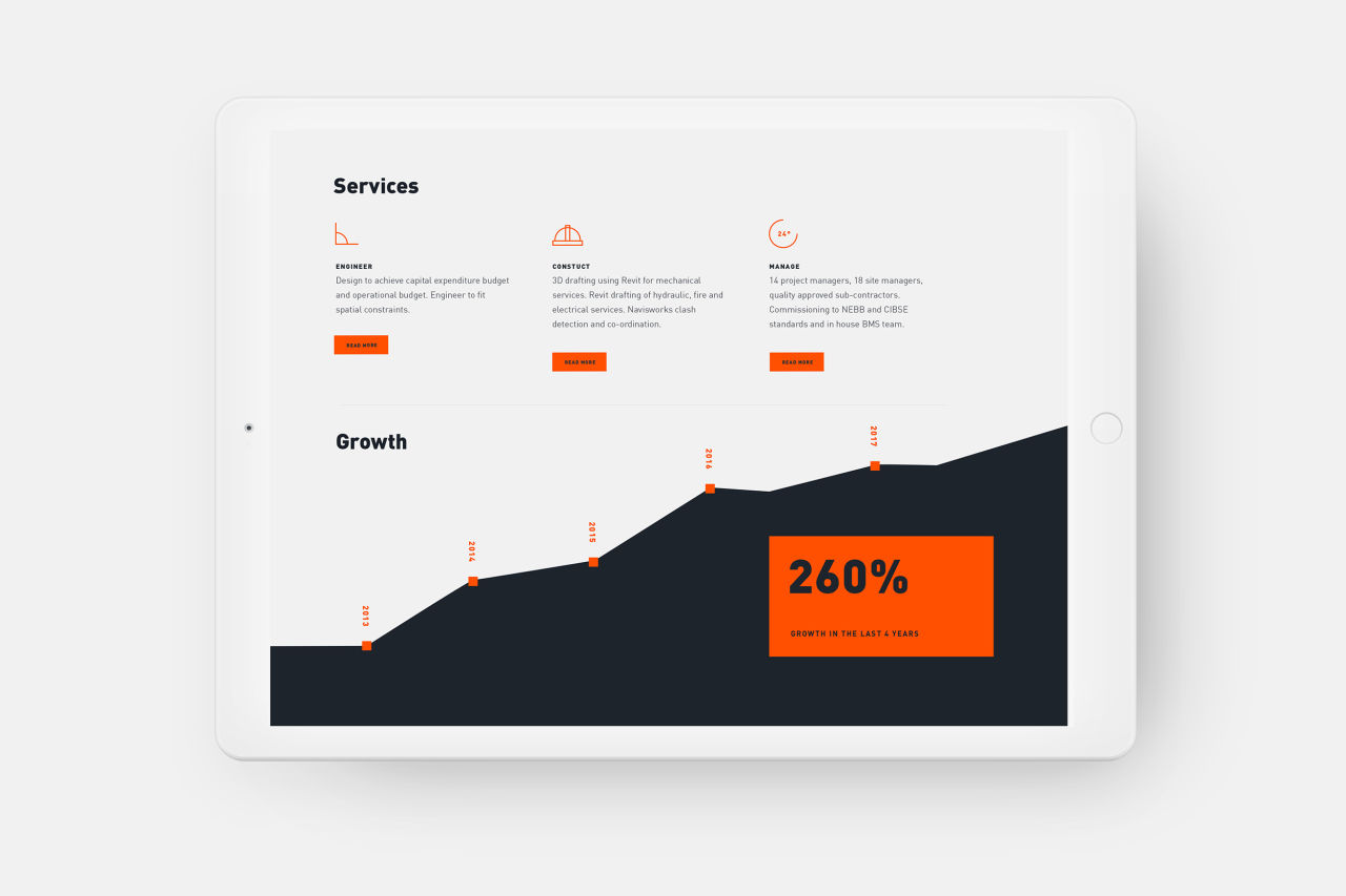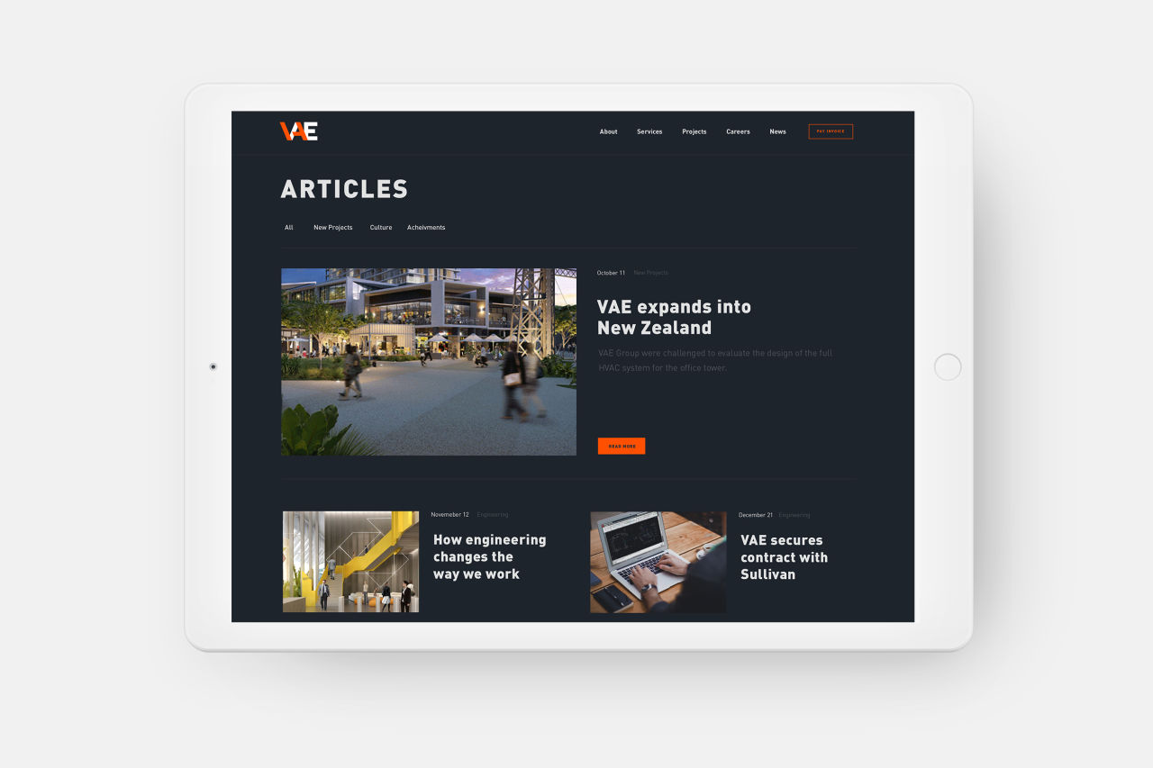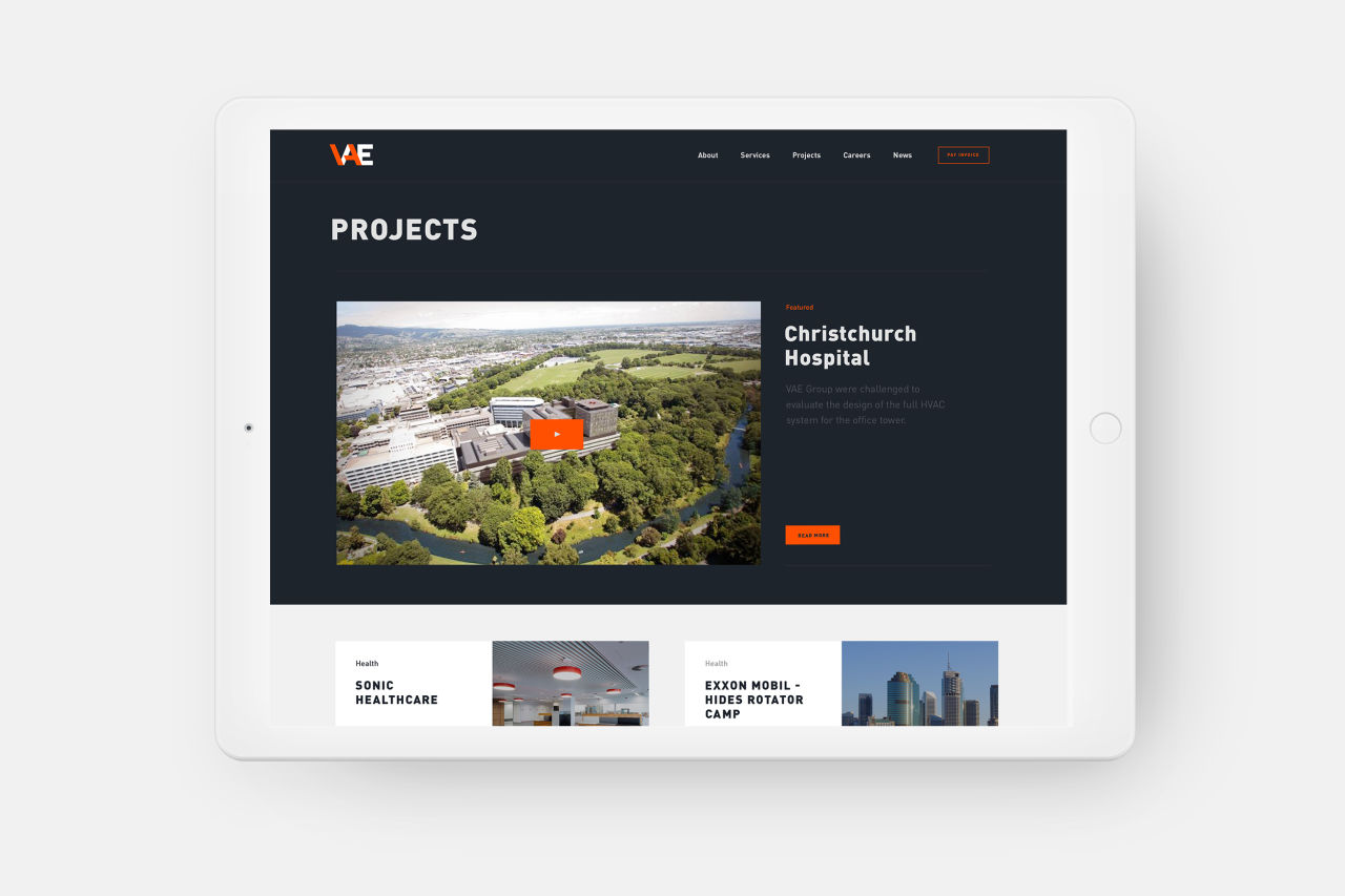We developed a content strategy that reflected VAE’s business strategy, structured around their engineering, construction and management capabilities. The homepage provides a glimpse into VAE’s scope of HVAC projects and services, with animated elements that reflect the energy of the business.
